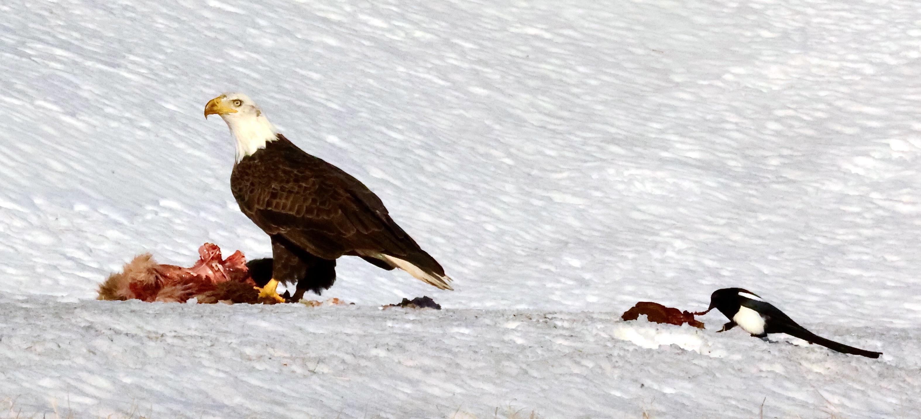 Bald Eagle feasting on roadkill deer, Magpies hope for a scrap of leftovers.